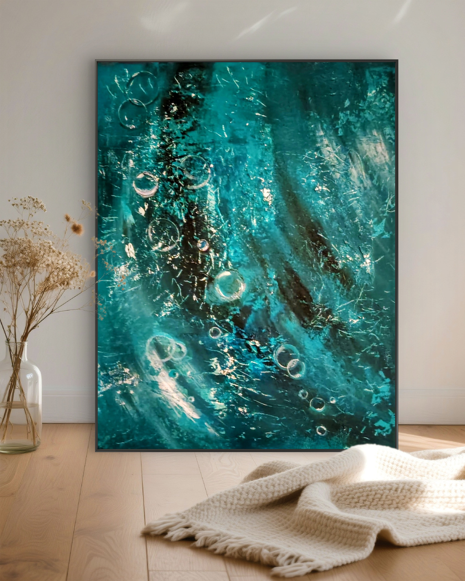 This work invites the viewer into the depths of the sea, where light transforms into a shimmering blue veil and silence guards its secrets. Bubbles rise toward the surface like ancient messages, vanishing before they can be revealed. The painting beckons us to pause for a moment beyond the water's mysterious curtain – to glimpse what the ocean allows to be seen only in dreams.